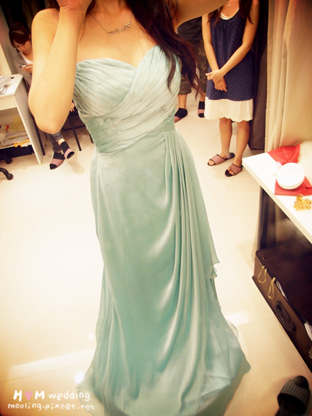 這是敬酒和送客的禮服,顏色是粉藍綠色,有點美人魚的感覺(羞