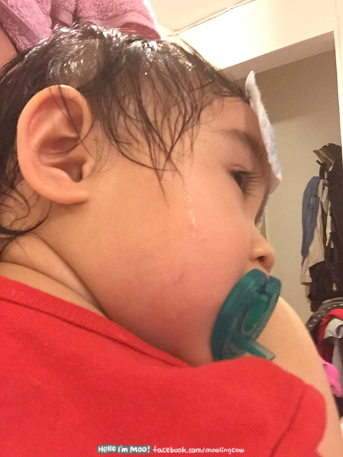 塞劑果然很強大,大概半小時後小哞就開始瘋狂出汗,燒也慢慢退下來了