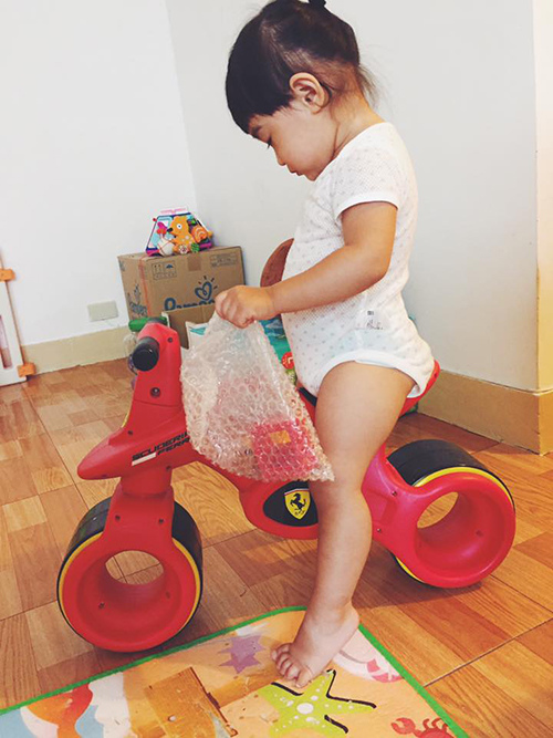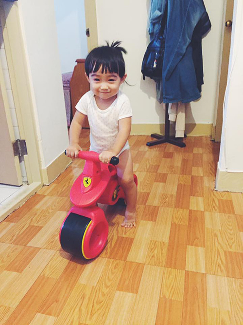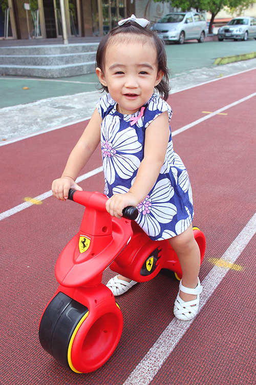 現在也聽得懂騎車車這個詞~有時她也會主動去推車子要我把她抱上去