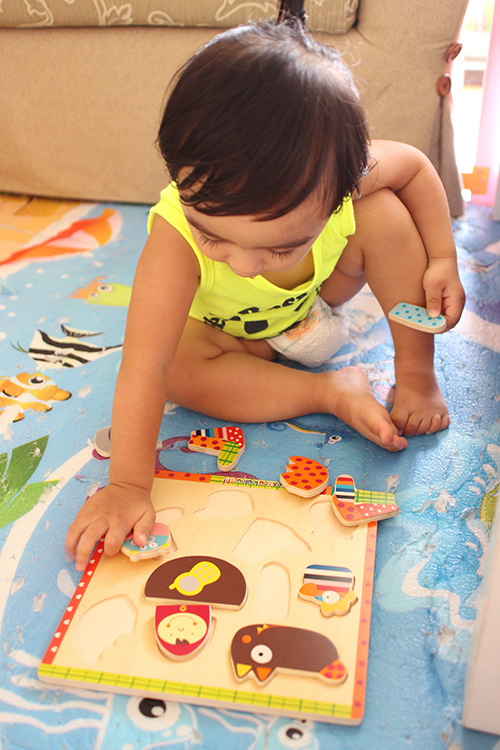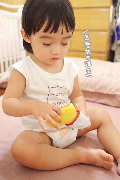 玩了一兩次後她就會自己對形狀了,不需要我再拿給她說放在哪裡