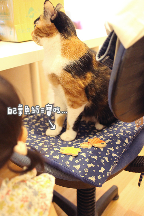 有一次她把魚抓著就跑走,跟在後面想說要拿去哪結果竟然是拿去給三寶!!!