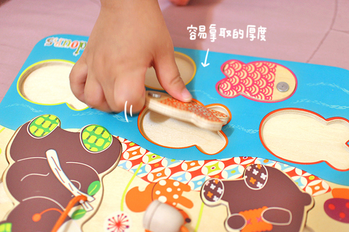雖然他們家的拼圖沒有小把手可以抓握,不過凸起的高度小哞也都很輕鬆就能拿起來