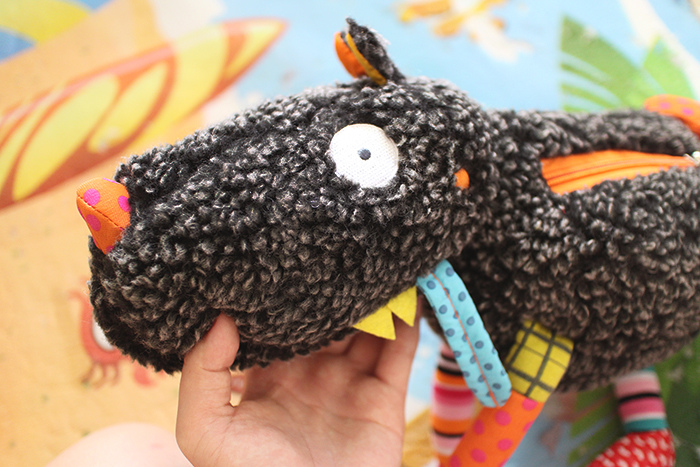 但大野狼黑色毛的材質容易沾黏到棉絮,玩之前可以先稍微黏一下