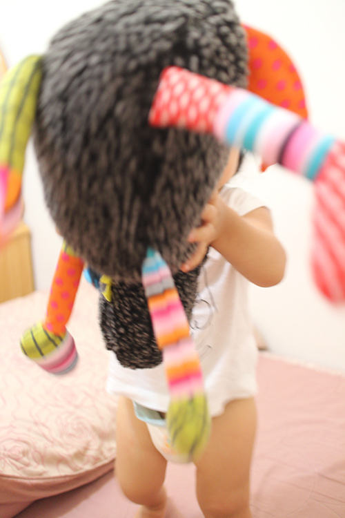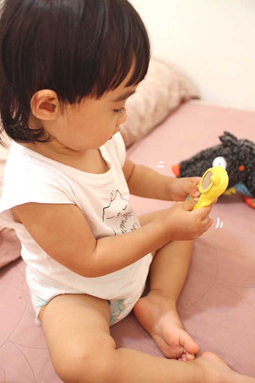 她還不會自己抓住毛巾的兩側,所以目前只能這樣玩