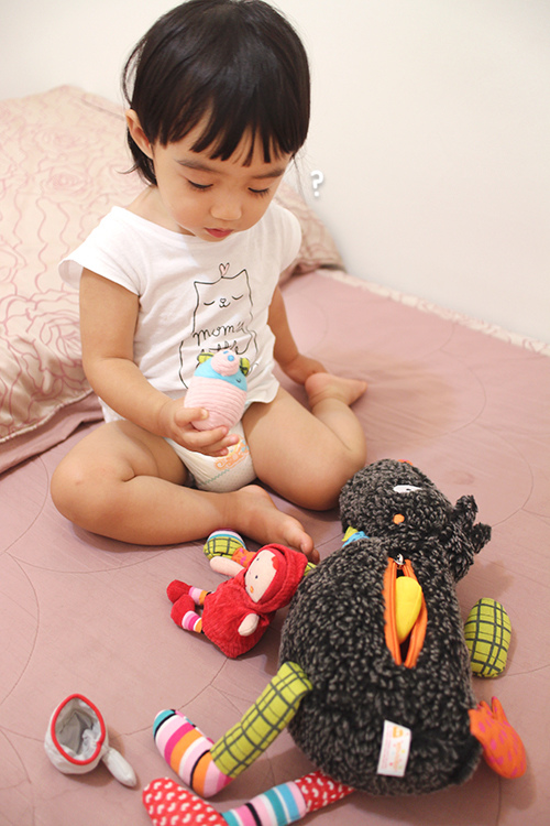 她也很認真地試了又試,除了小紅帽比較大不好塞拿其它都很OK