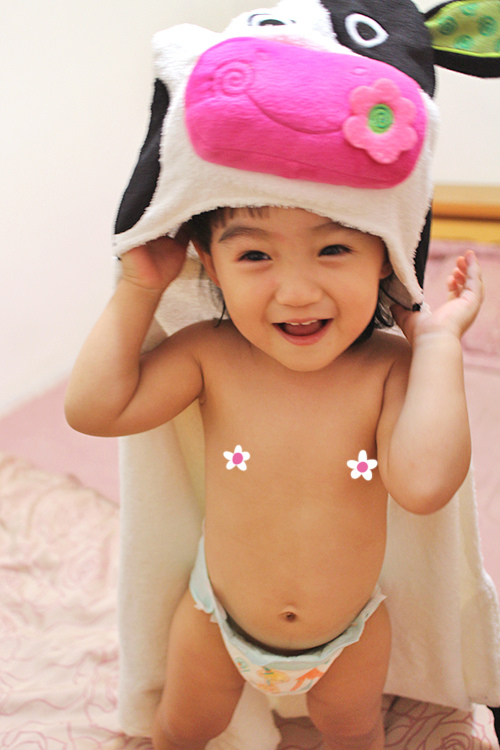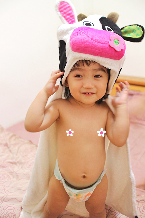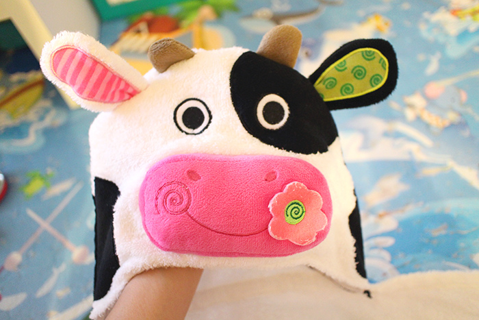 乳牛的帽子因為嘴巴部分厚厚的一塊,比較不好直接用來擦乾頭髮