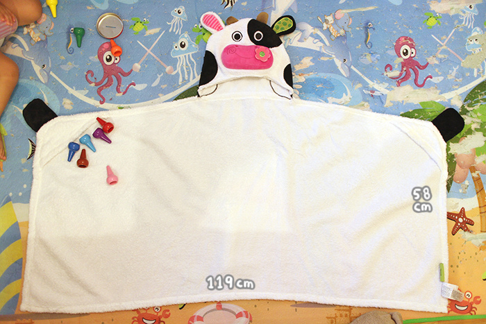 毛巾的實際使用長度其實很長,把小哞包起來後還多了很多出來