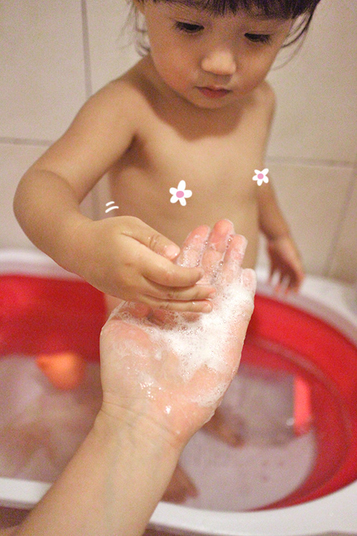 搓出泡泡後先洗頭,再用頭上的泡泡抹完全身