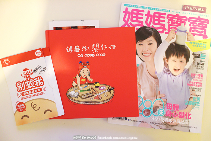 裡面有紅嬰仔手冊(抓周紀錄用)、媽媽寶寶雜誌、防蚊貼片