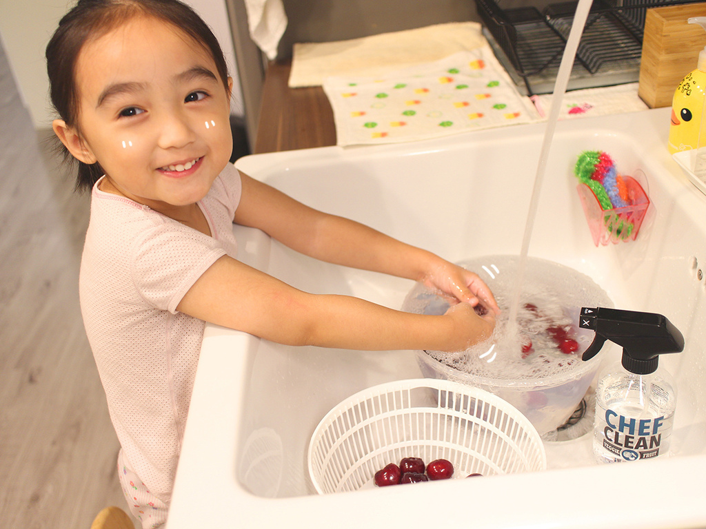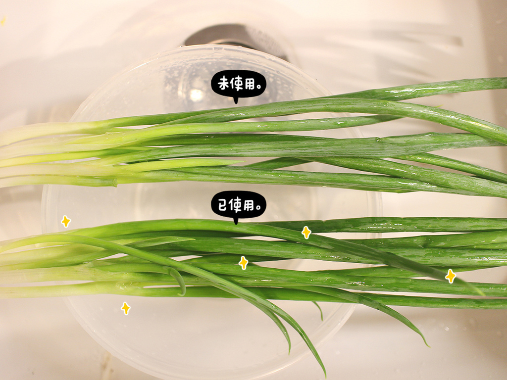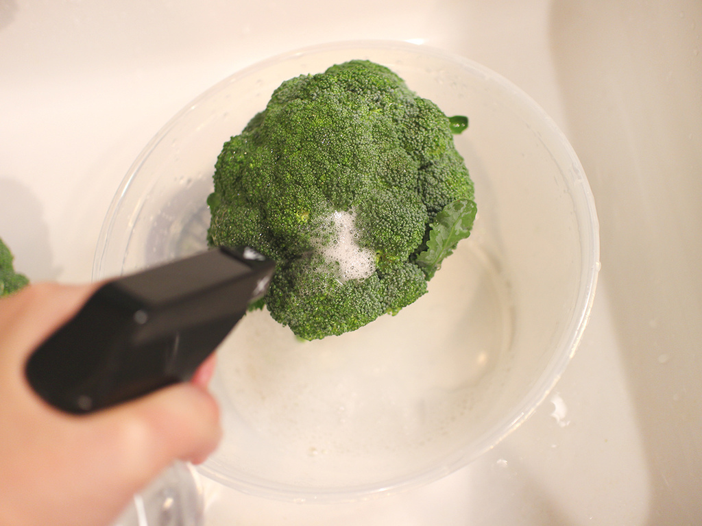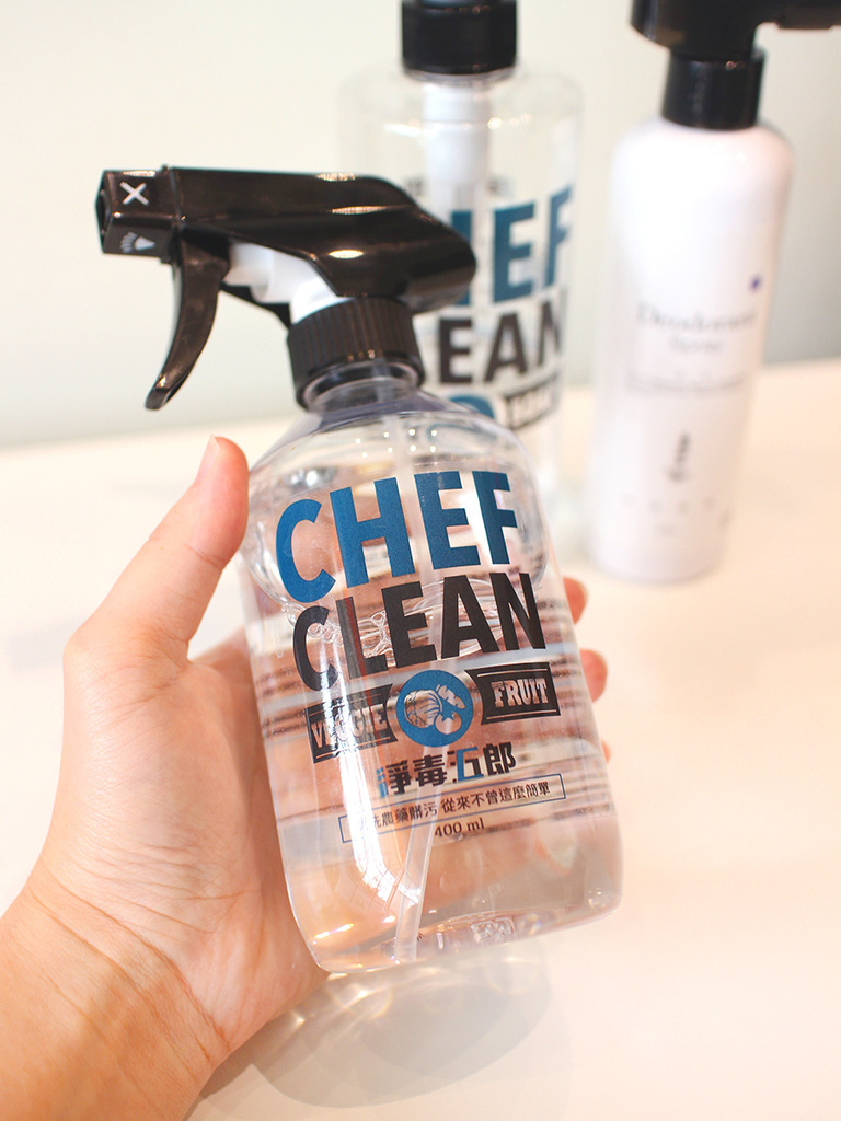正確的使用方式是噴在蔬果表面,再浸泡2-3分鐘簡單搓洗一下,最後再用清水沖洗就完成了