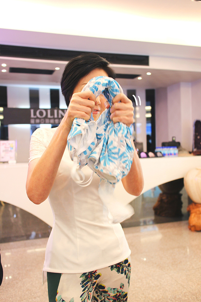 現場大家有問穿上去會不會很難活動,她馬上示範了幾個伸展動作給大家看說完全不會