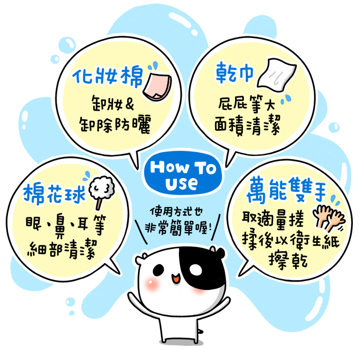 使用方式也很簡單,可以搭配家裡都會有的卸妝棉或是乾、濕紙巾等等