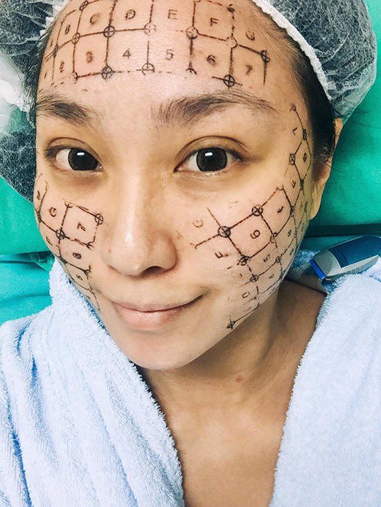 在麻醉前要先在臉上轉印傳說中的神秘黑格子